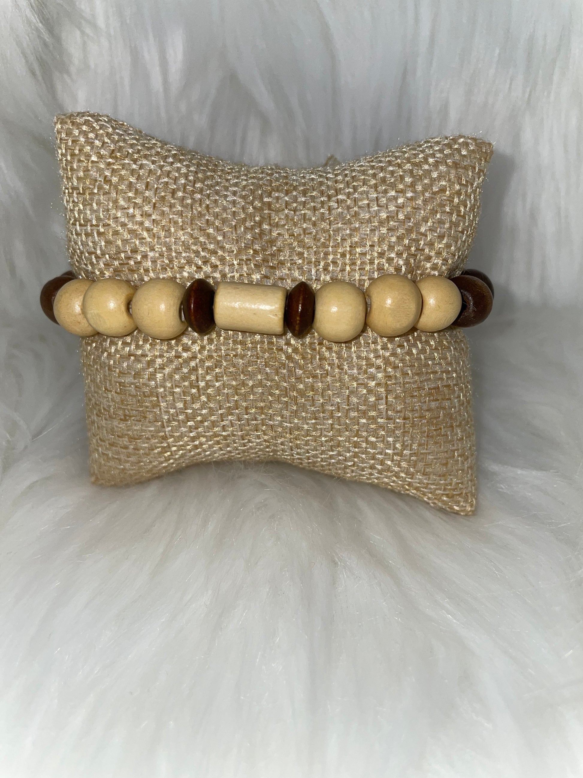Make a bold statement with this beige and brown bead stretch bracelet. Its earthy tones and natural wood beads create a striking contrast that complements any outfit. Designed for comfort and style, this bracelet stretches to fit perfectly, adding an adventurous edge to your look.