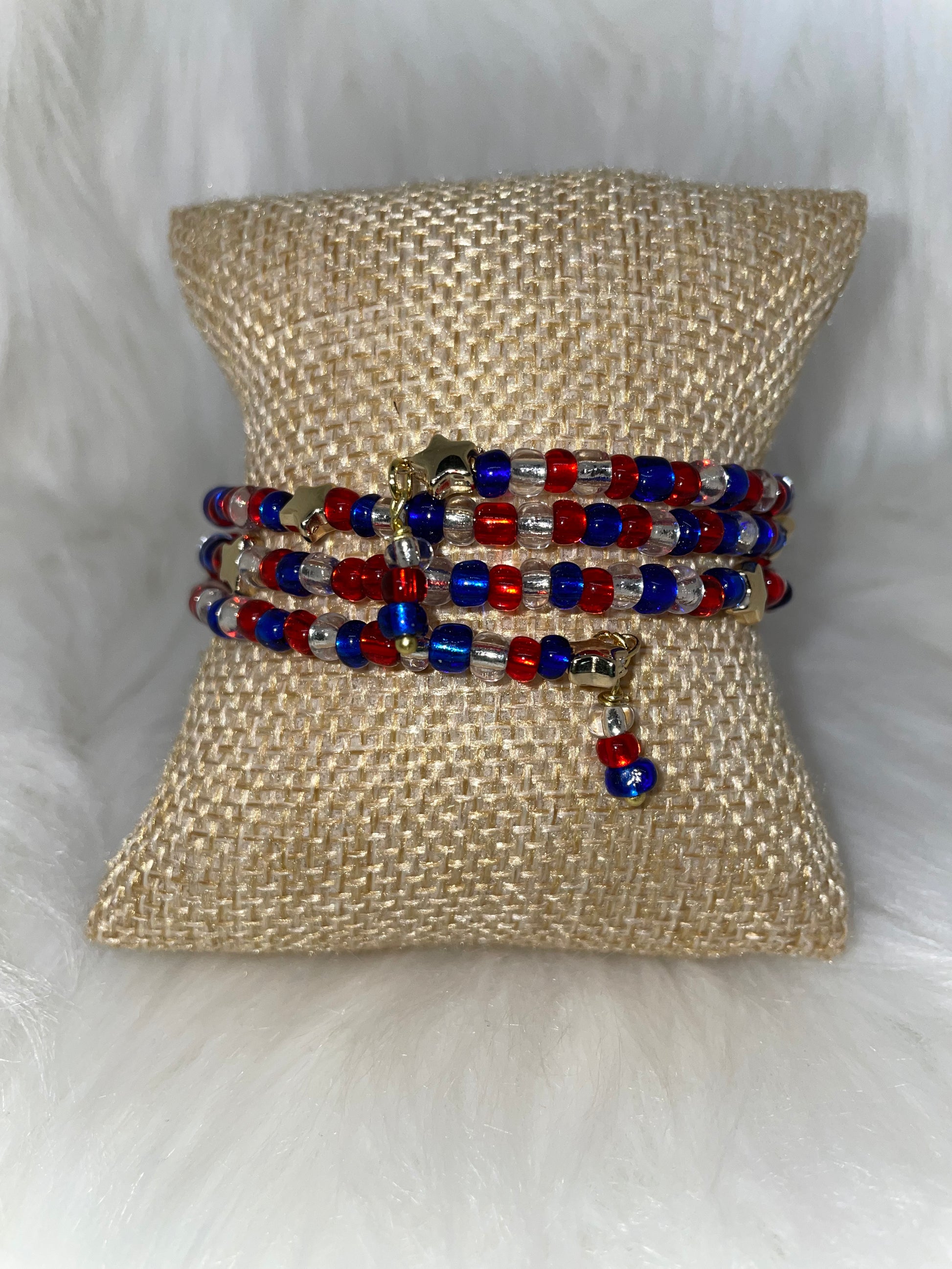 Celebrate your patriotic spirit with this red, white, and blue wire-wrapped bracelet, accented by elegant gold stars. Its vibrant colors and delicate design make it a meaningful accessory to show your support and pride. Comfortable and stylish, it’s perfect for everyday wear or special occasions where you want to express your love for your country.